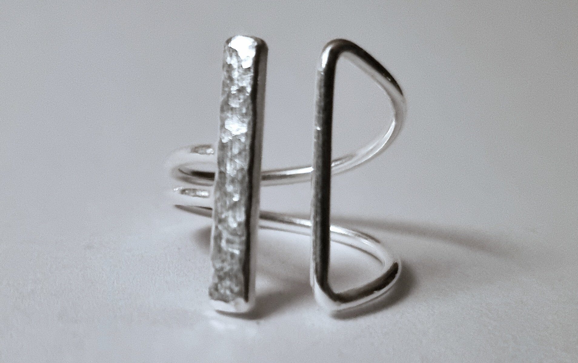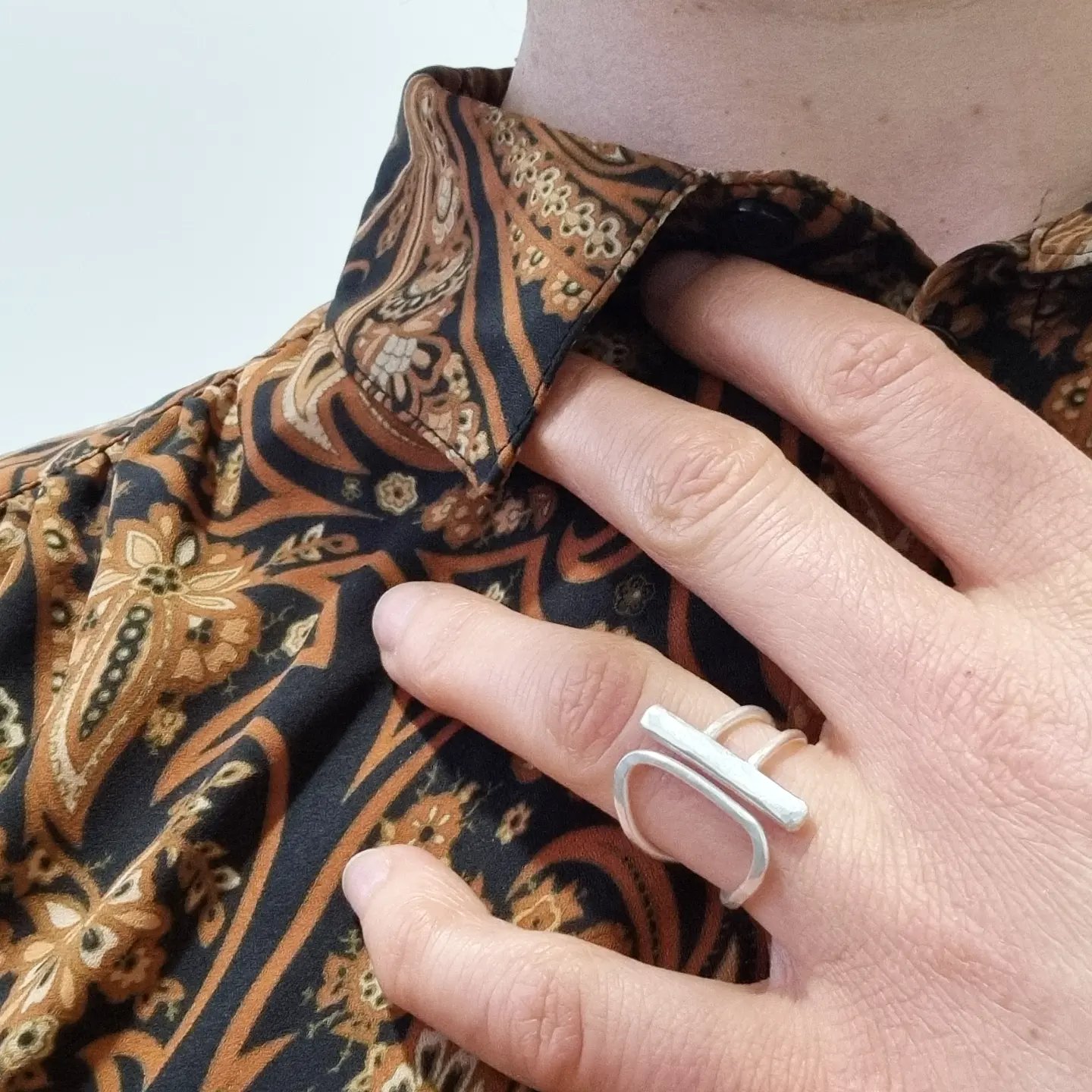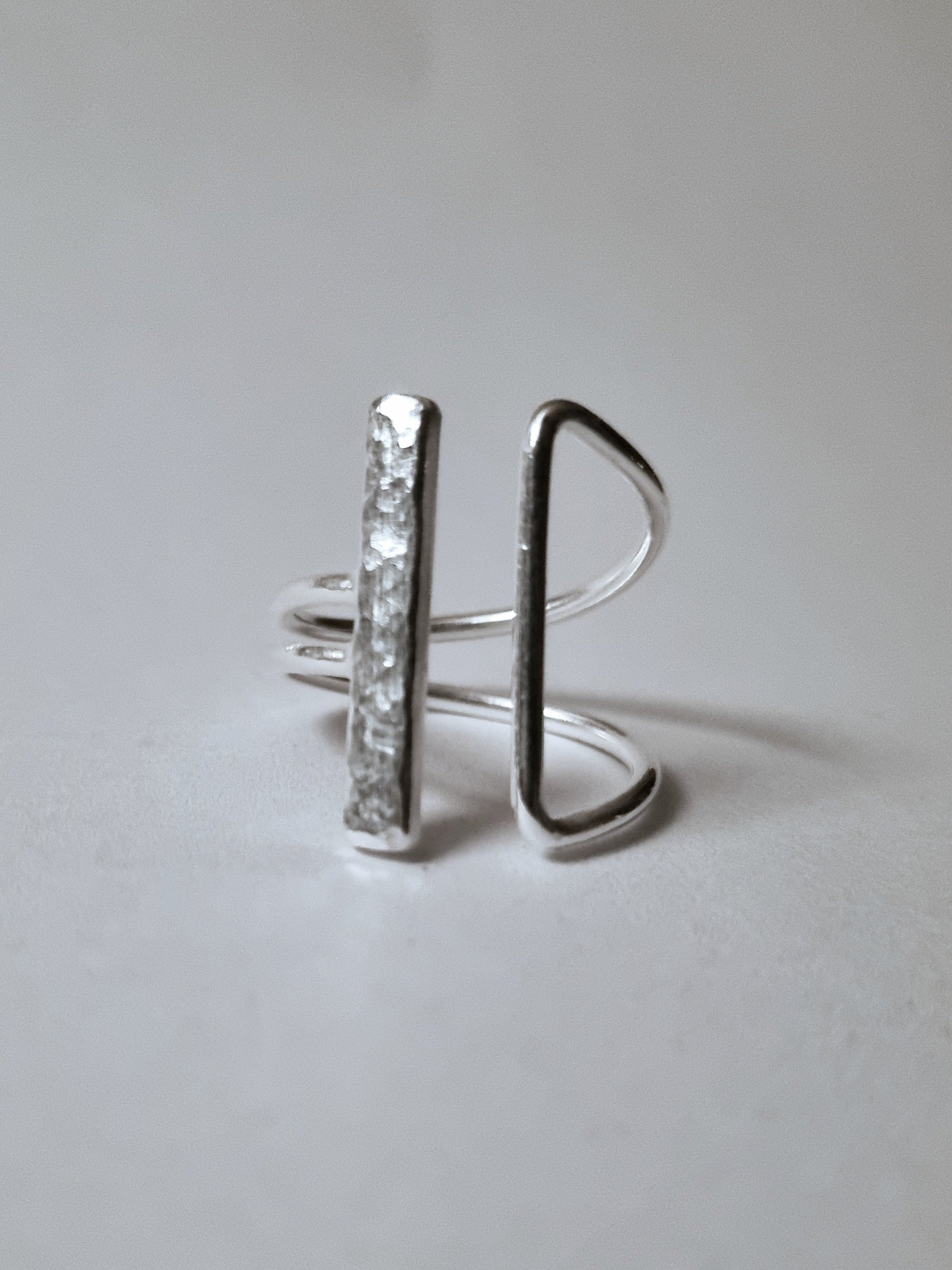 Ring av 1,5 mm silvertråd. Ca 20 mm bred längs fingret. Den öppna formen gör ringen lite fjädrande.