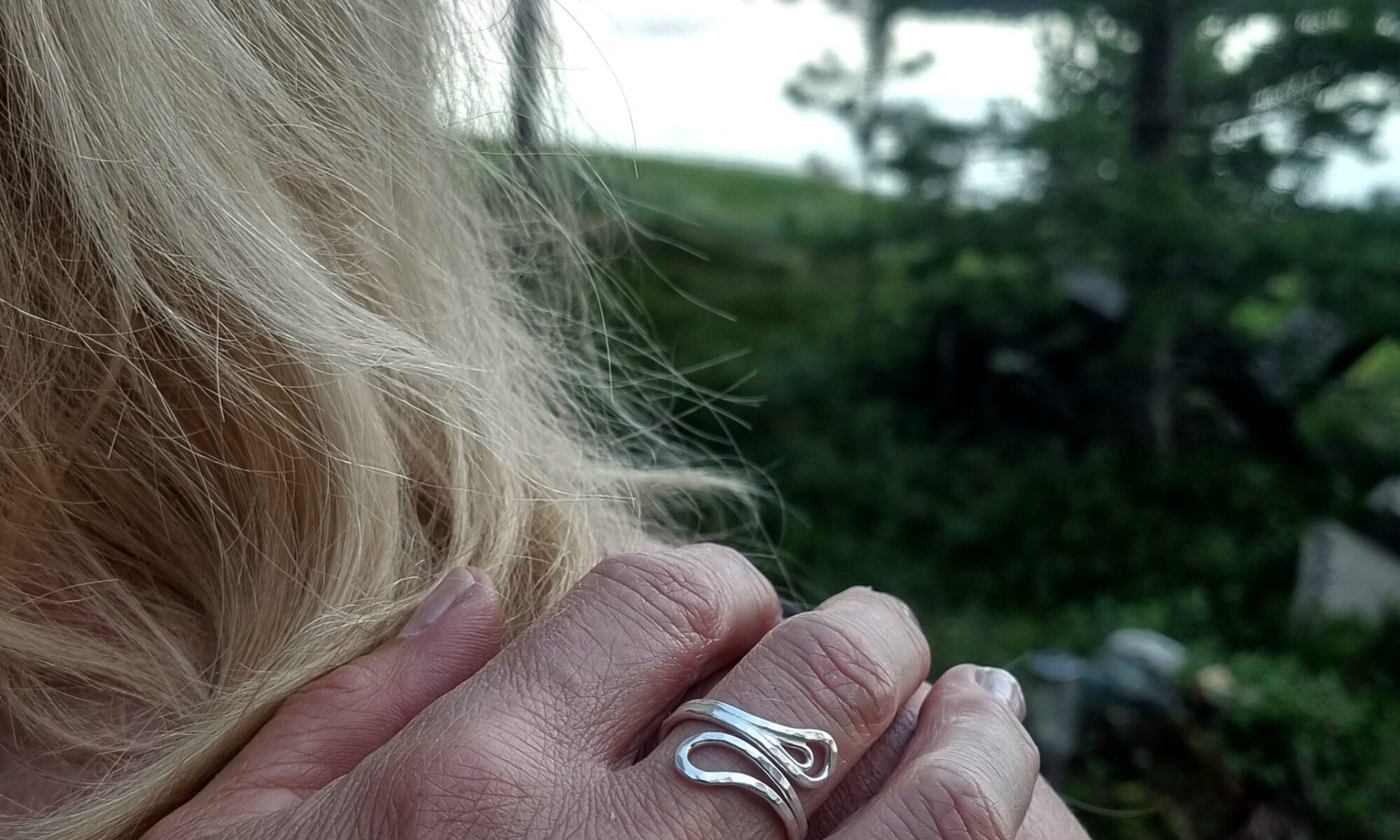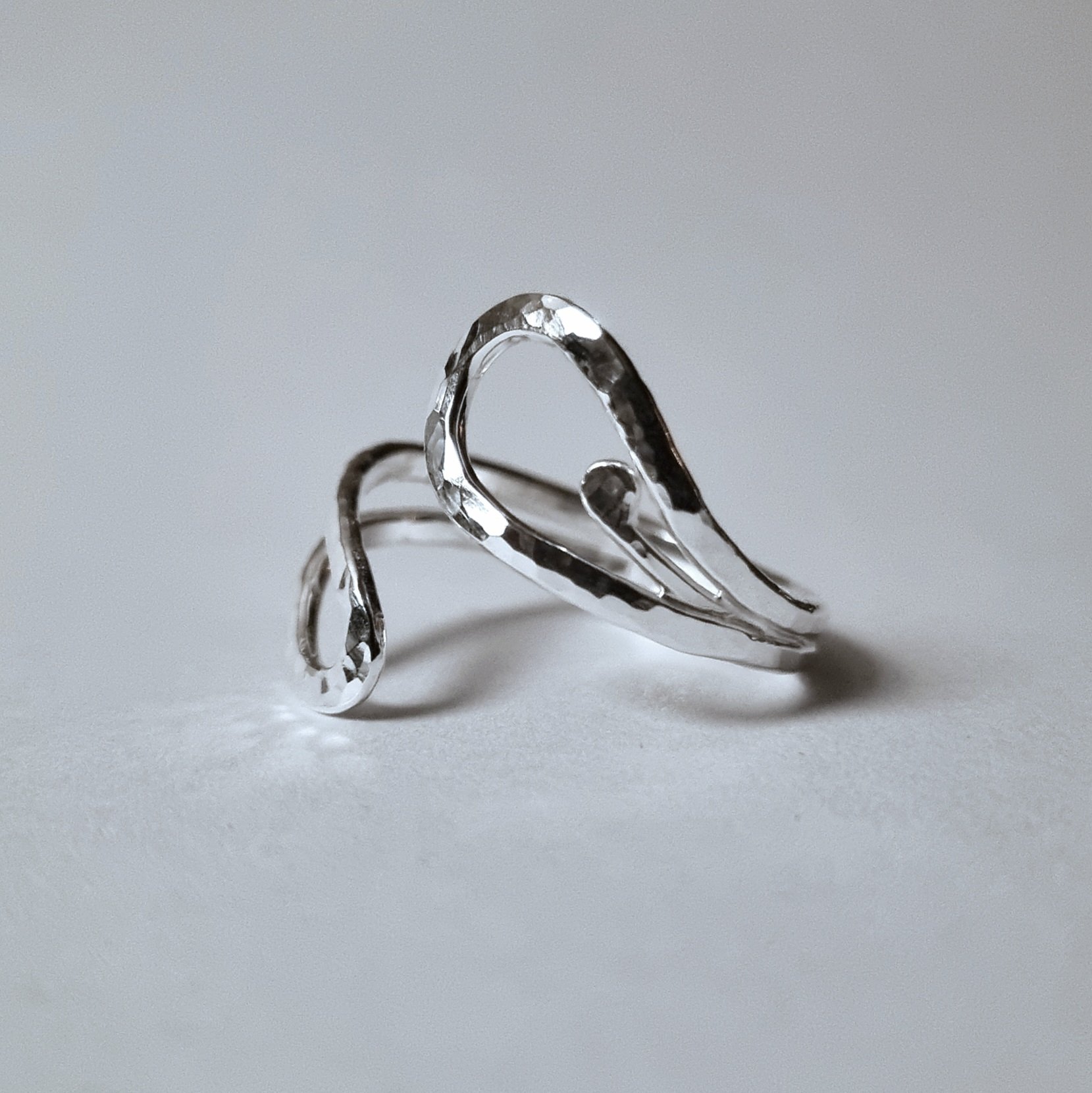 Ring med organisk form och hamrad yta, smidd av 1,5 mm silvertråd. Finns i olika storlekar. Den öppna formen gör ringen lite fjädrande.