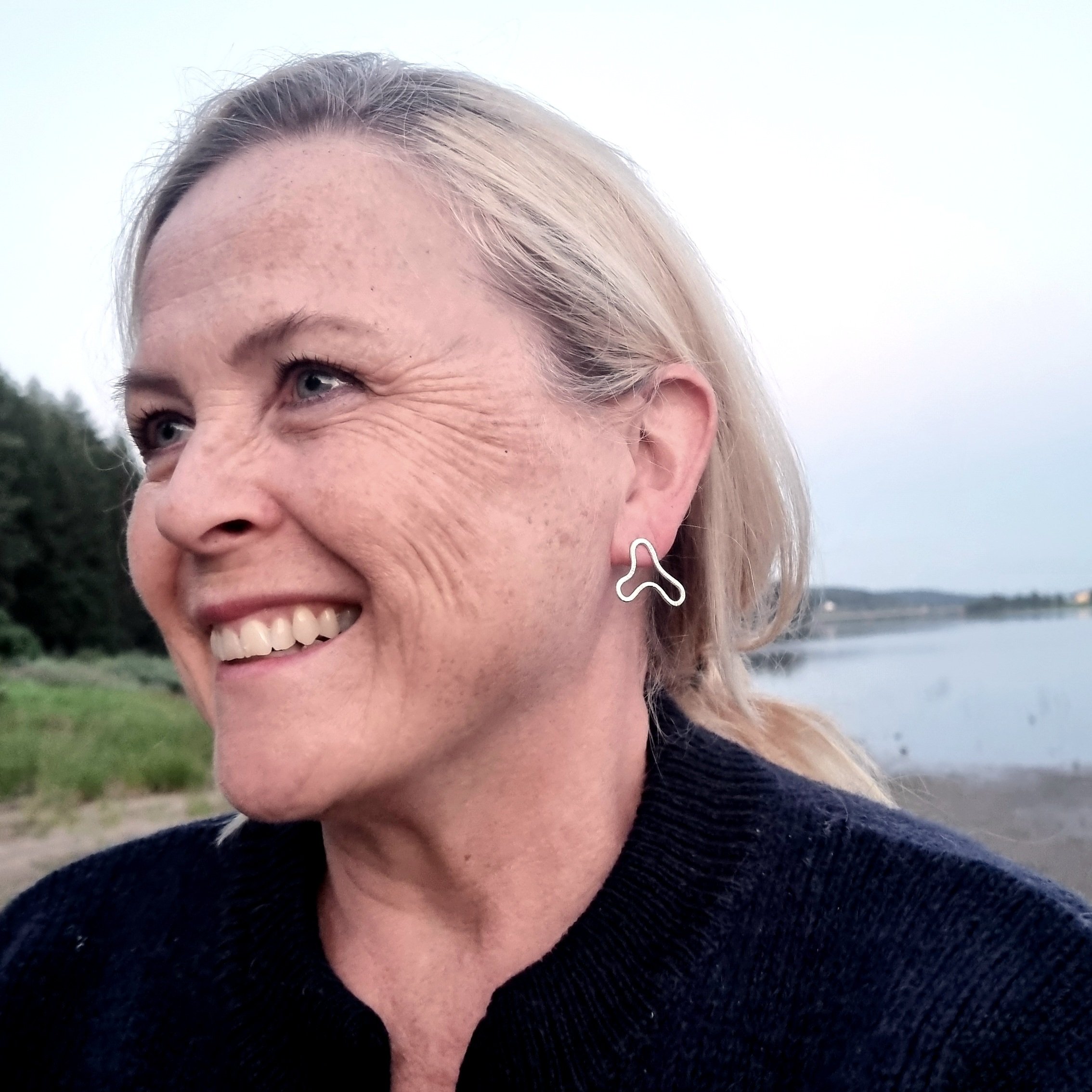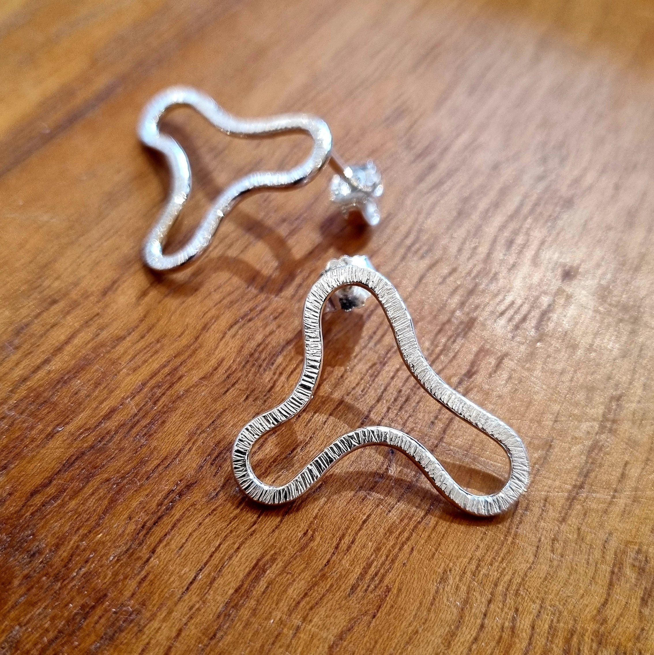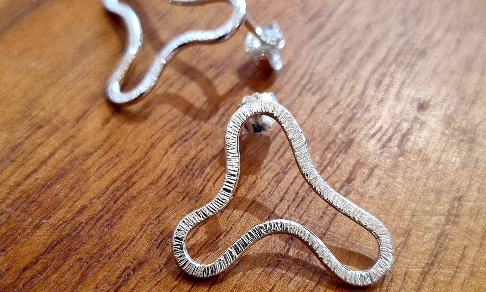 Örhängen smidda av silvertråd med bearbetad yta.